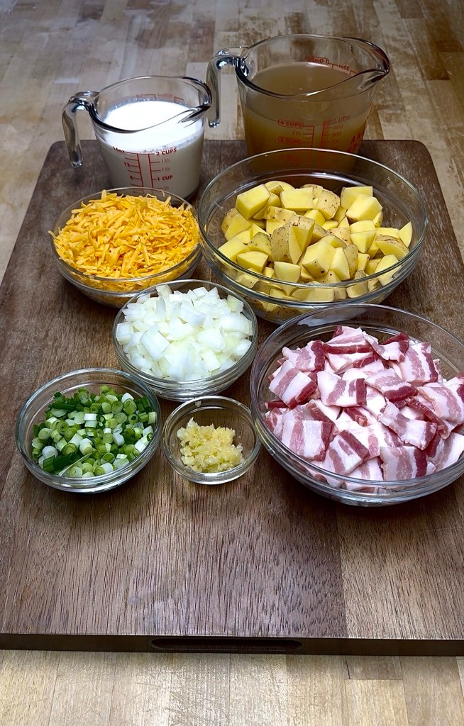 - Start by prepping everything to keep cooking stress-free. Dice your potatoes (I skip peeling, but you can), slice the bacon, chop the onion, slice the green onions, mince the garlic, and measure out your broth, cream, and wine — and pour yourself a glass while you’re at it.