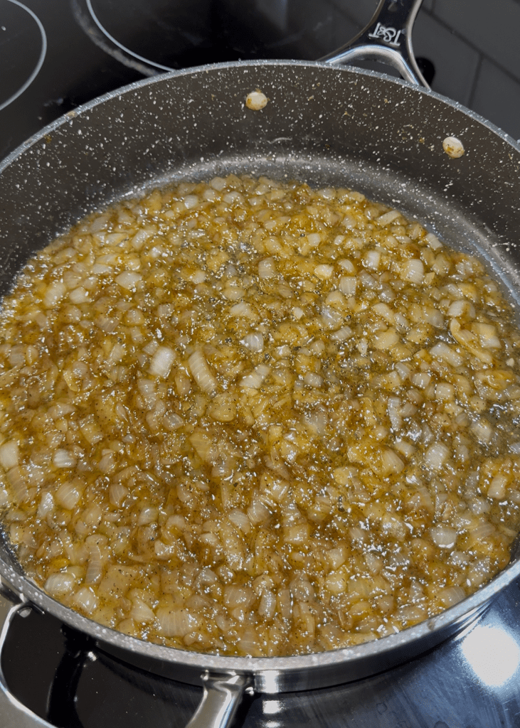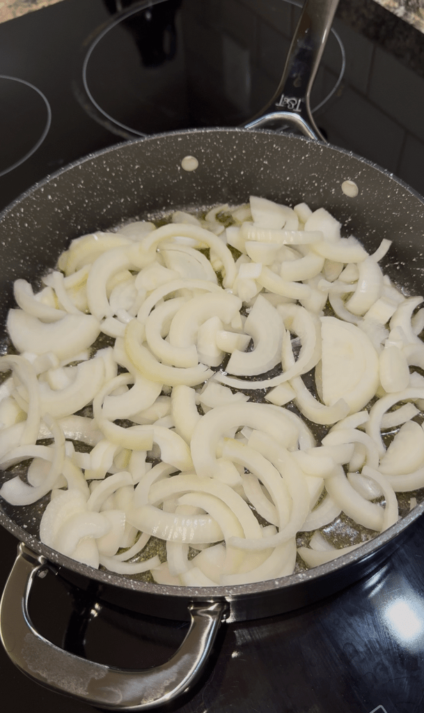 - Begin by slicing your onions into 1/4” thick slices then throw into a pan with butter and cook over low heat, stirring occasionally, until caramelized. This process can take up to 1 hour or more to properly caramelize the onions
